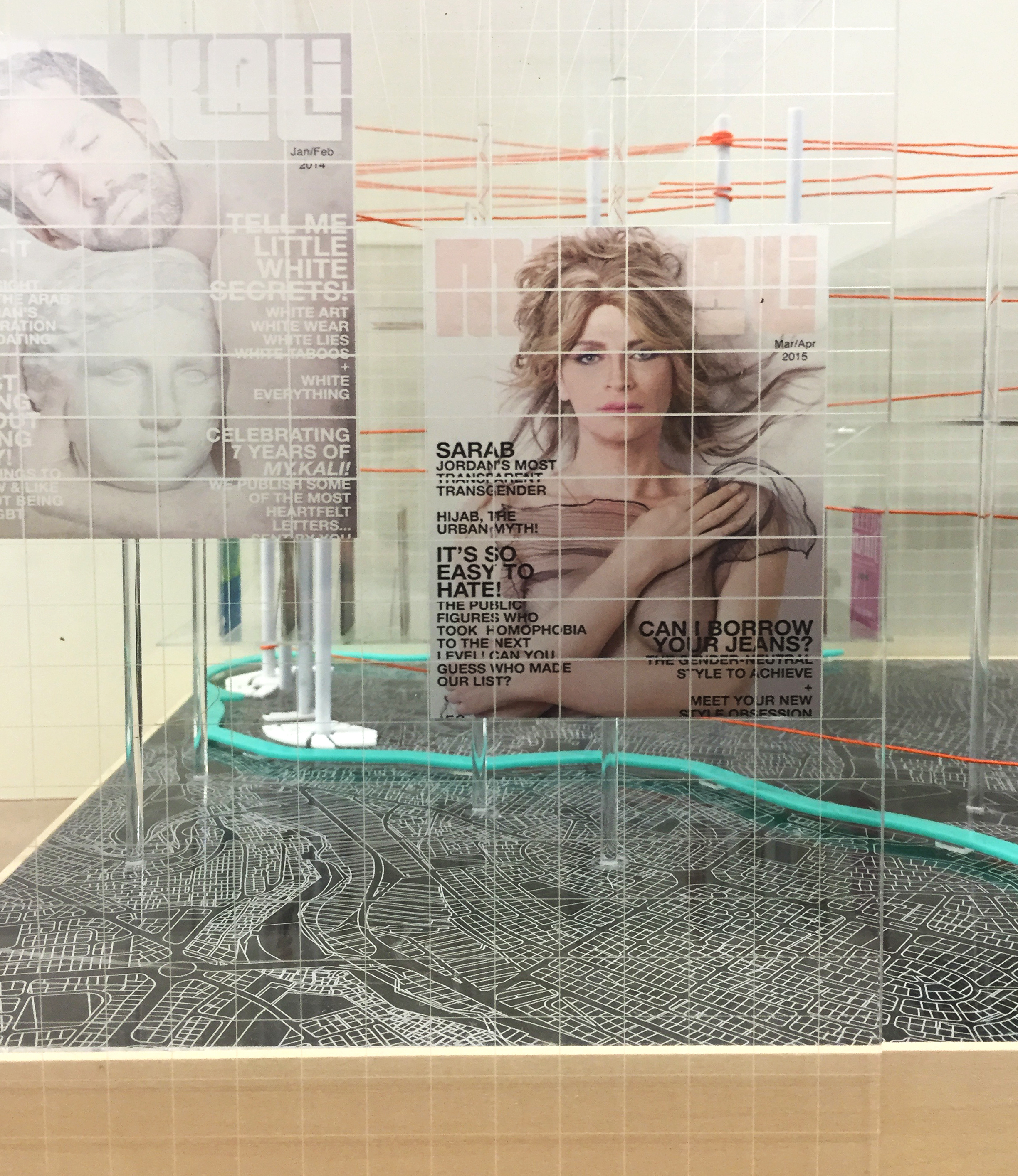 The city of Amman is mapped on the floor and the LGBTQ archipelagos are highlighted through vertical dowels connected through strings that symbolize the limited movement of queer bodies around the city. Objects of cultural and social relevance to the queer community in Amman is also displayed along with contextual description of the various significant events that have occurred in recent years as well as literature developed in the region about queer identity.